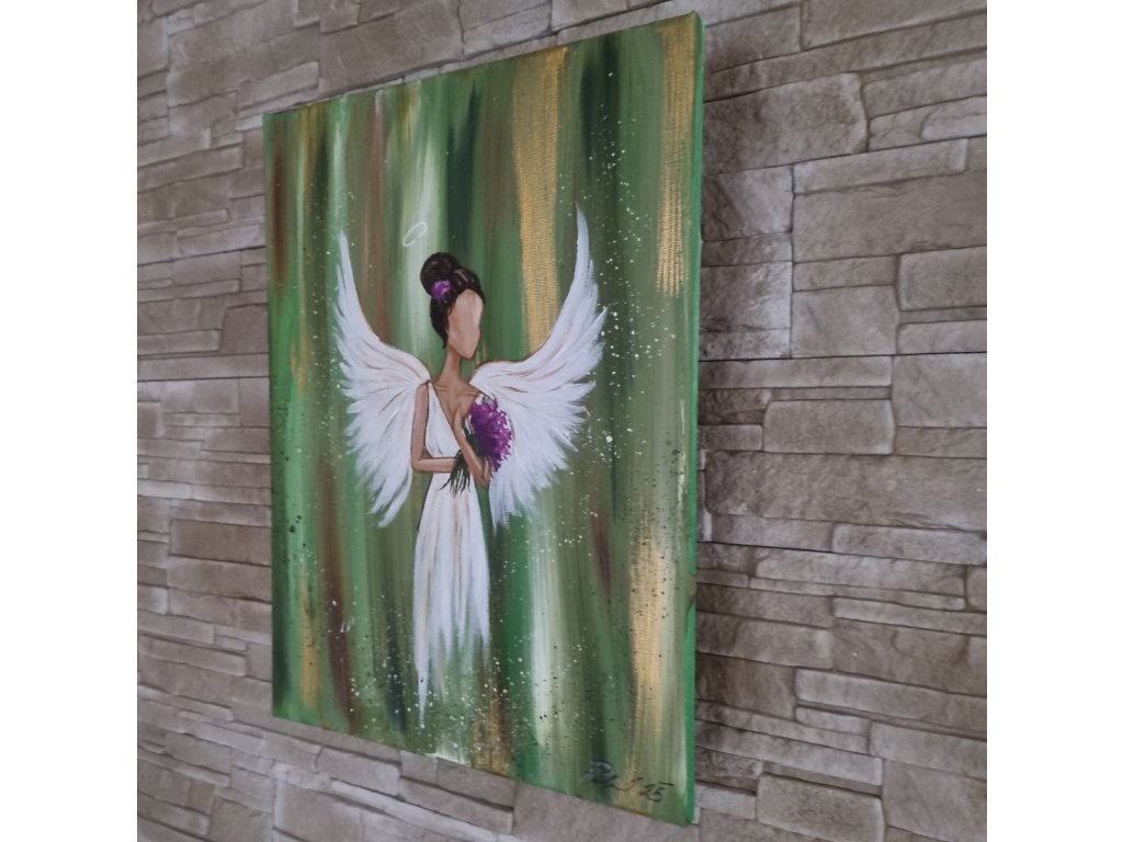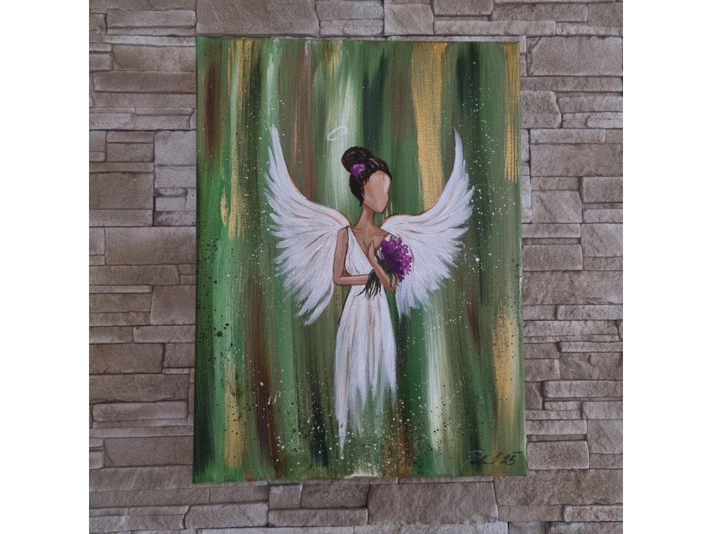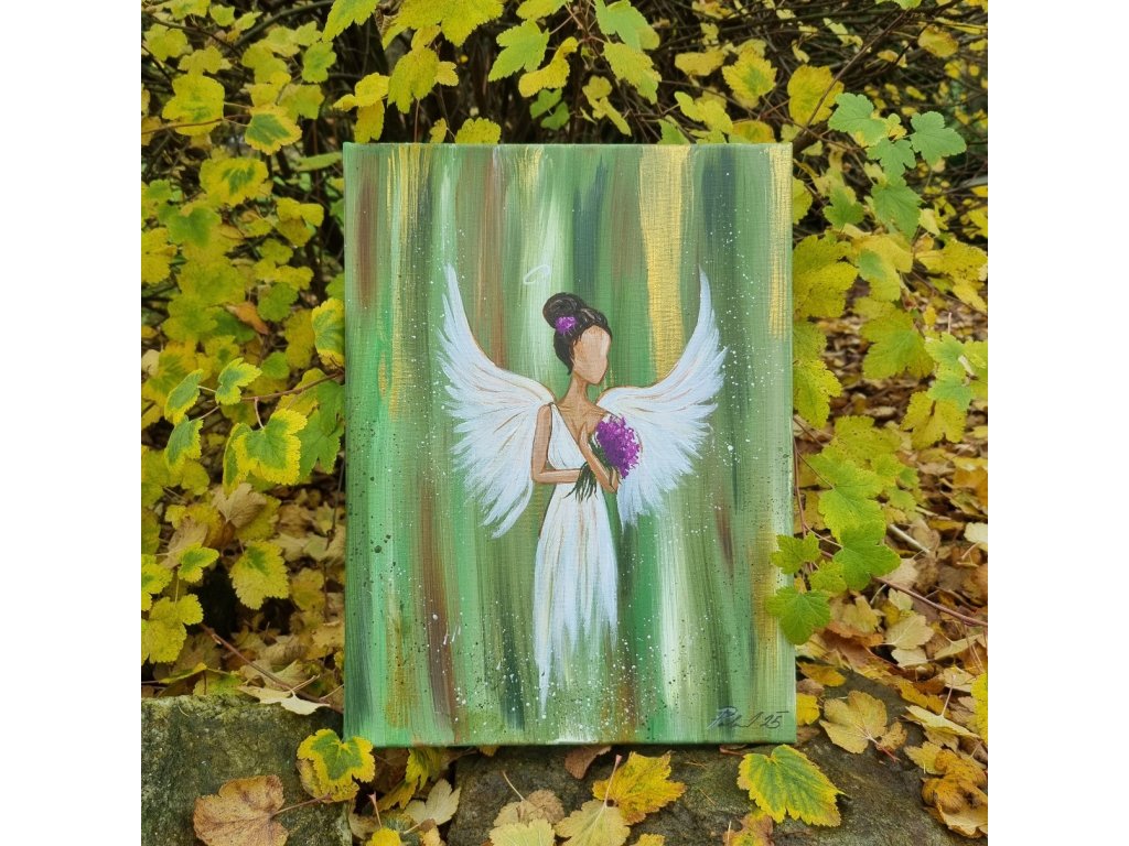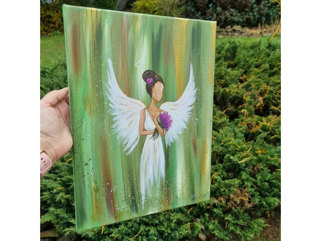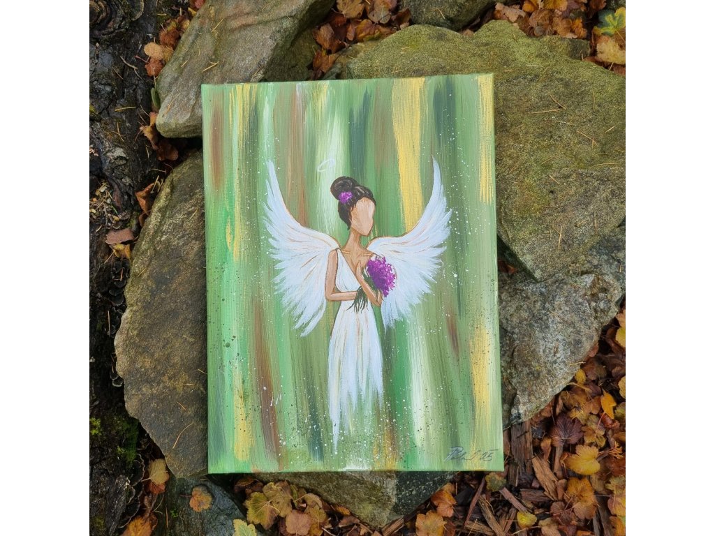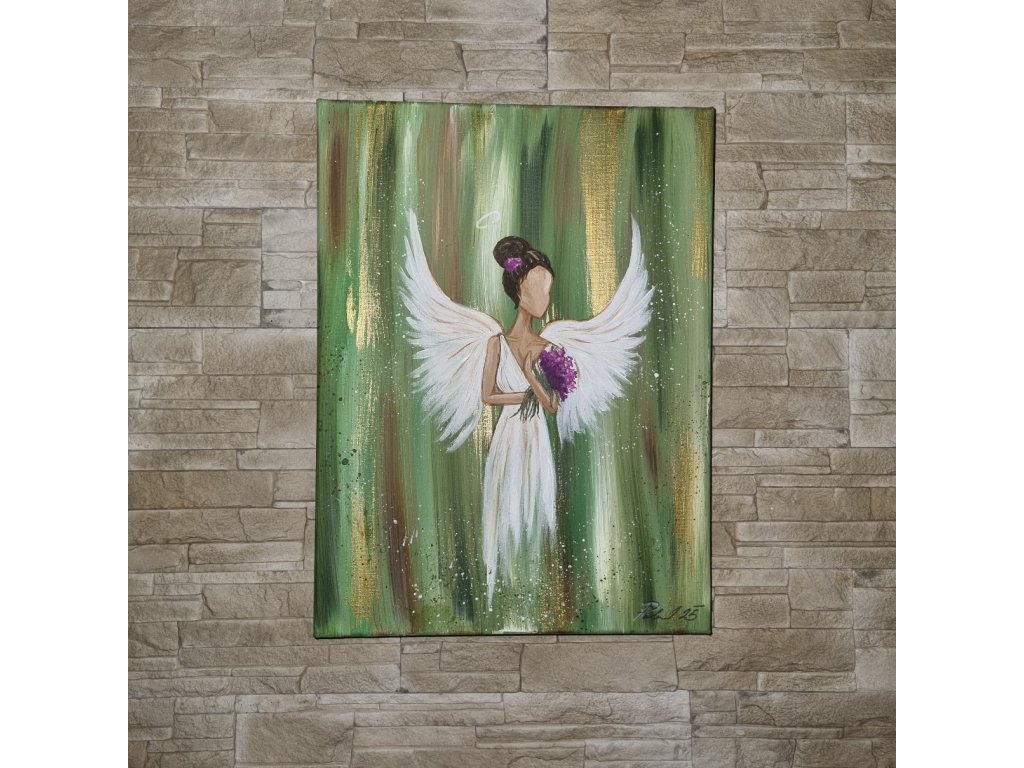 Vneste do svého interiéru klid a harmonii s originálním obrazem „Anděl s kyticí“ od české výtvarnice Sabiny Polanské. Tento ručně malovaný akryl na plátně vyniká jemnými tóny zelené a zlaté, které dodávají prostoru eleganci a duchovní hloubku.