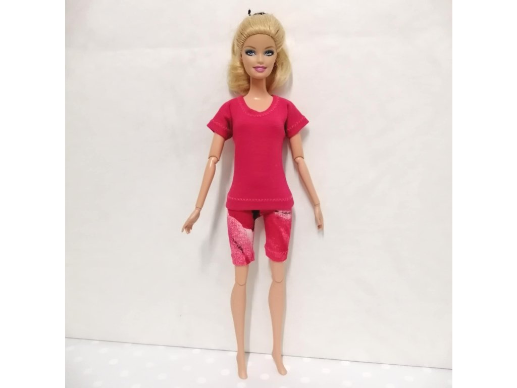 Komplet se skládá z trička a kalhot (legin). Tričko s krátkým rukávem a elastické krátké kalhoty (legíny) pro panenku Barbie jsou ušité z kvalitní látky (složení 95% bavlna, 5% elastan), zapínání je na suchý zip.