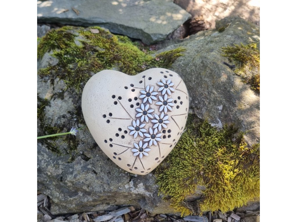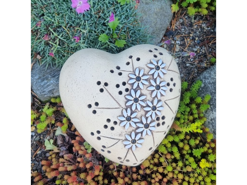 Originální zahradní dekorace ve tvaru srdce s jemným květinovým motivem. Ručně zpracovaný kámen působí něžně a elegantně – ideální jako: