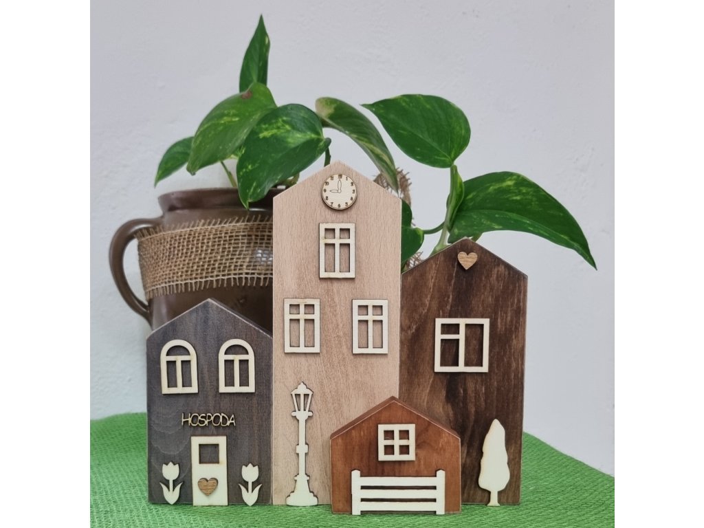 Dřevěné domečky - vesnička s hospodou a domem s hodinami - 4 ks - dekorace do bytu.
