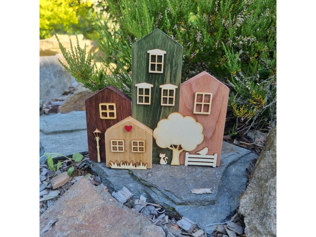 🌳🐾 Dřevěné domečky – vesnička s kočkou a stromem (4 ks)