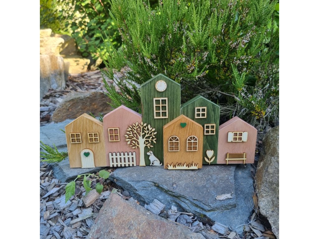 🐶 Dřevěné domečky – vesnička s pejskem (6 ks)
