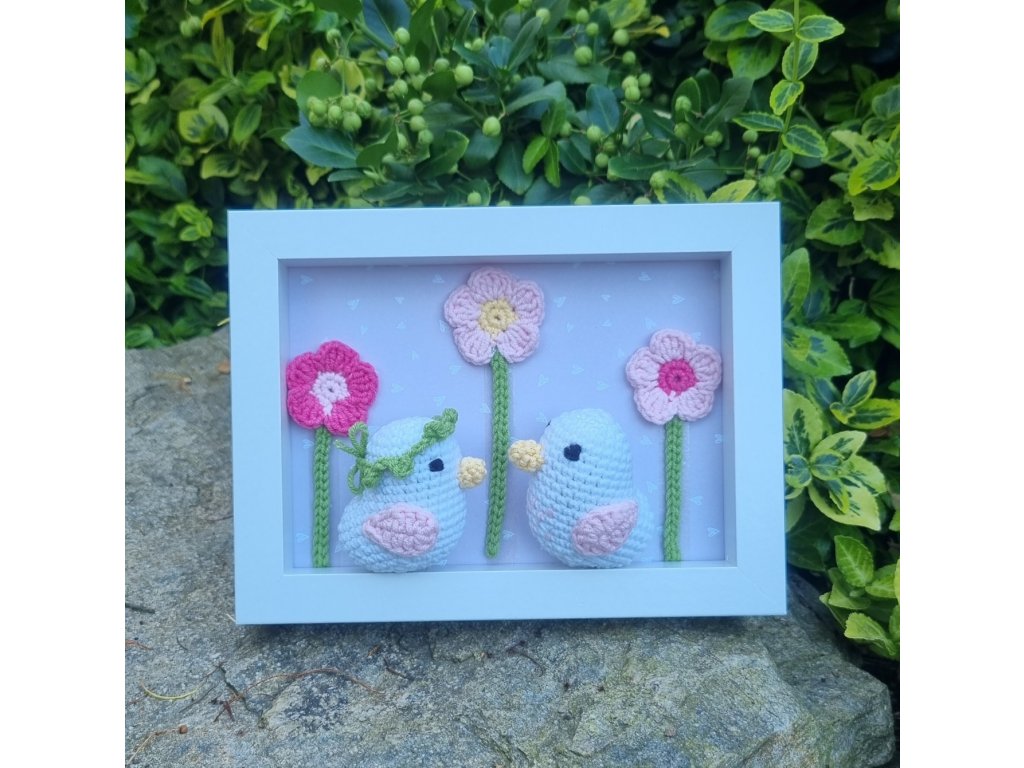 🧶 Háčkovaný obrázek s bílými ptáčky a kytičkami – ručně vyráběná dekorace s kolíčkem na přání