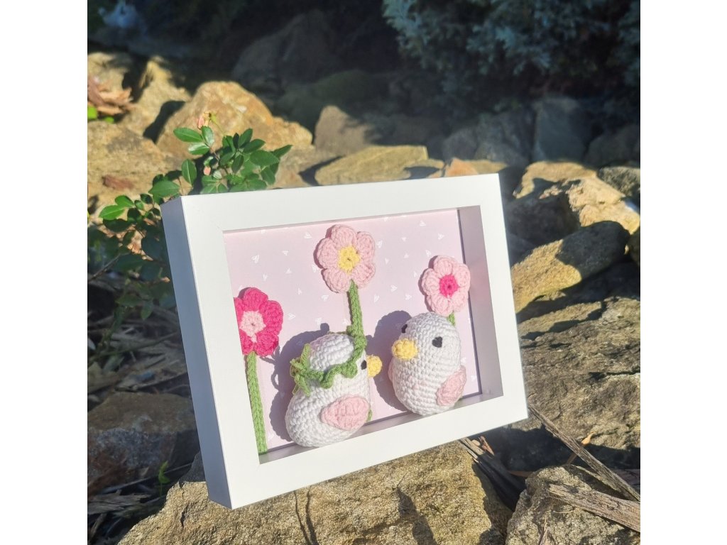Originální obrázek s háčkovanými bílými ptáčky a jemnými háčkovanými kytičkami v bílém dřevěném rámu je výsledkem pečlivé ruční práce, která spojuje tradiční řemeslo s jemným designem. Dva ptáčci – symbol lásky, něhy a společného domova – jsou umístěni v rámečku o velikosti 15×20 cm. Uvnitř se nachází malý kolíček, na který lze připevnit přání, fotografii nebo drobnou obálku.