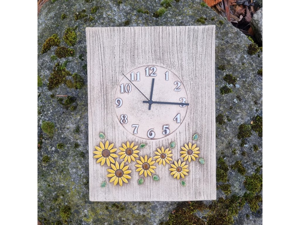 Nástěnné keramické hodiny s motivem slunečnic, plně funkční, součástí je hodinový strojek.
