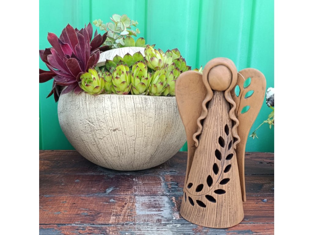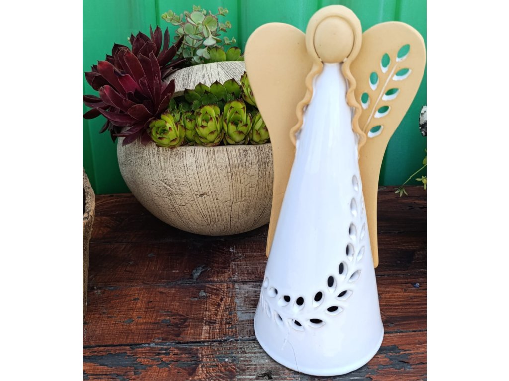 Svícen - keramický dekorační anděl s větvičky a zdobeným křídlem na svíčku, vhodný do interiéru i exteriéru.