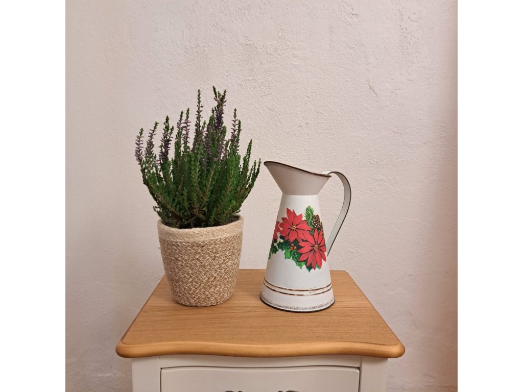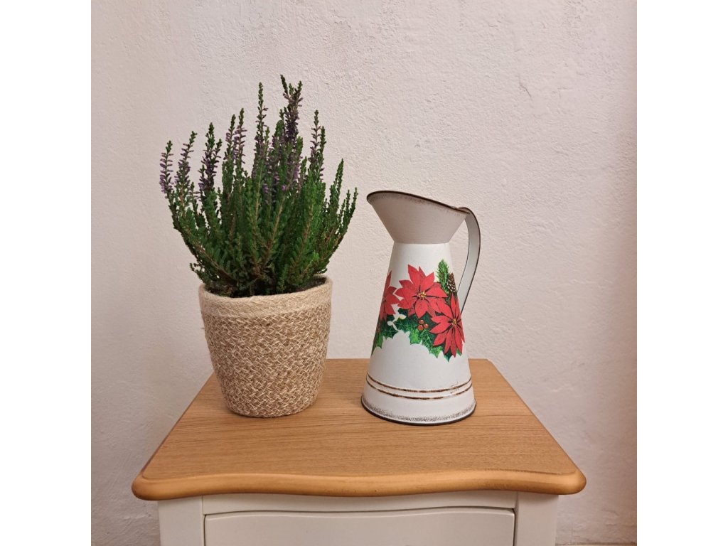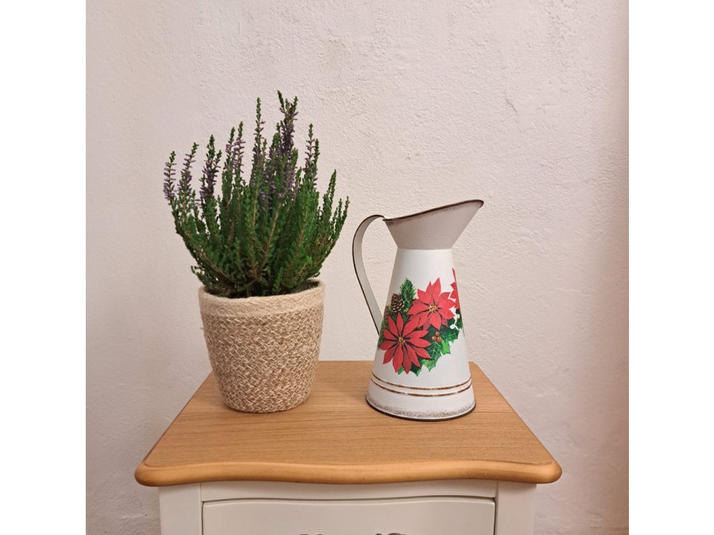 Elegantní plechová konvička s motivem vánoční hvězdy na jemně bílém podkladu je ručně zdobená technikou decoupage a opatřená matným lakem, který chrání povrch a zároveň zachovává přirozený, přírodní vzhled. Květinový vzor působí svěže, romanticky a zároveň energicky – ideální jako dekorace do interiéru, na chalupu, balkon nebo jako stylový doplněk do zahrady.