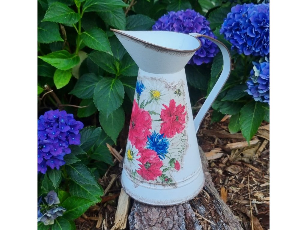 Elegantní plechová konvička s motivem vlčích máků na jemně bílém podkladu je ručně zdobená technikou decoupage a opatřená matným lakem, který chrání povrch a zároveň zachovává přirozený, přírodní vzhled. Květinový vzor působí svěže, romanticky a zároveň energicky – ideální jako dekorace do interiéru, na chalupu, balkon nebo jako stylový doplněk do zahrady.