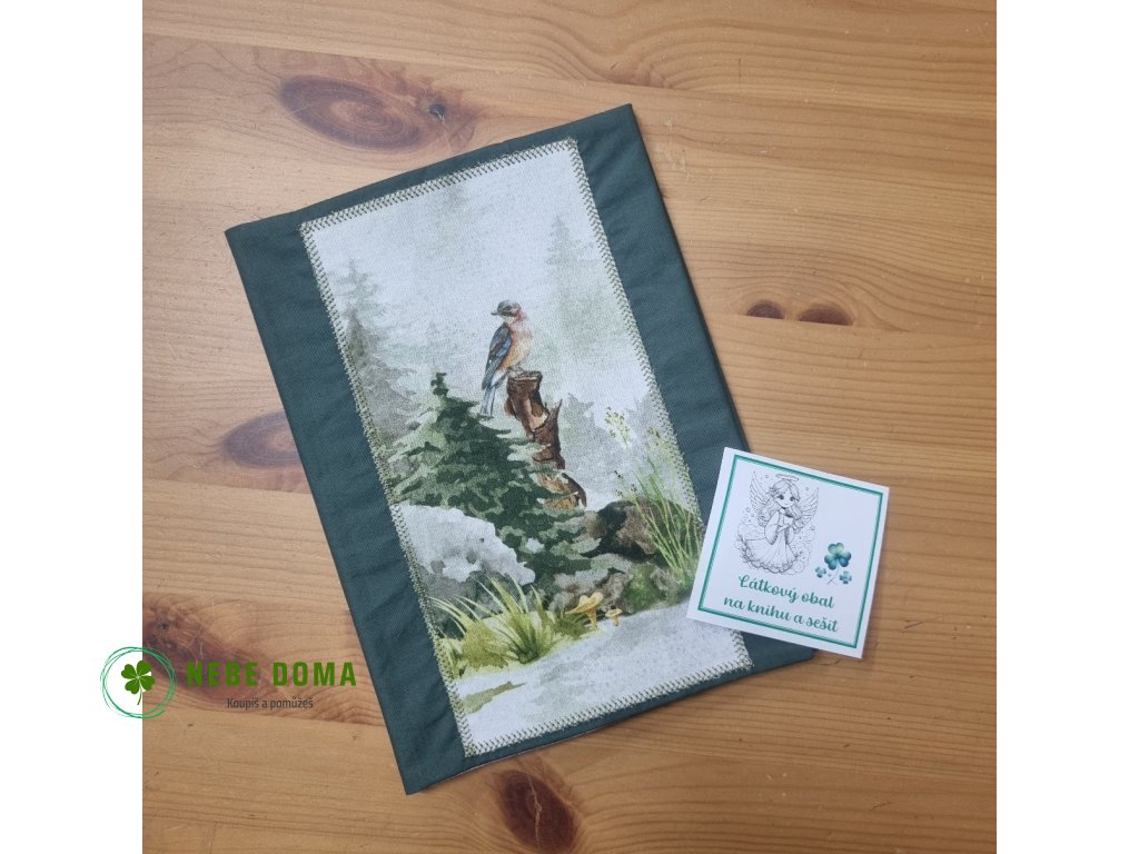 Látkový univerzální obal na knihu (bez štítku na jméno) s motivem lesa a zvířat - sojka