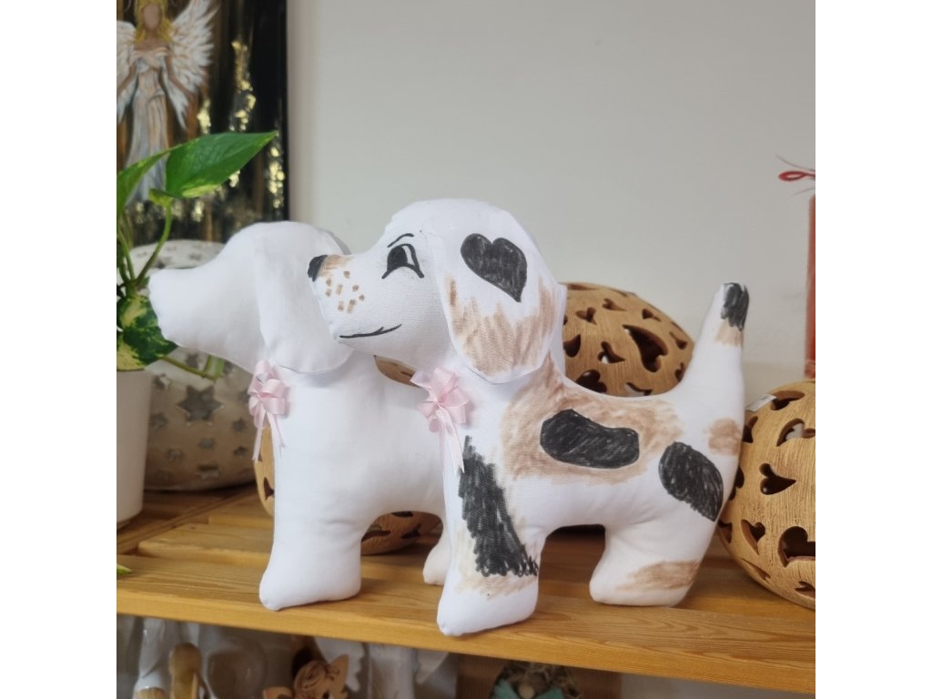Kvalitně ušitý bavlněný pejsek je vhodný k dotvoření. Pejska může vymalovat malý umělec nebo velký kreativec. Pejsek je ozdobený na krku barevnou mašličkou.