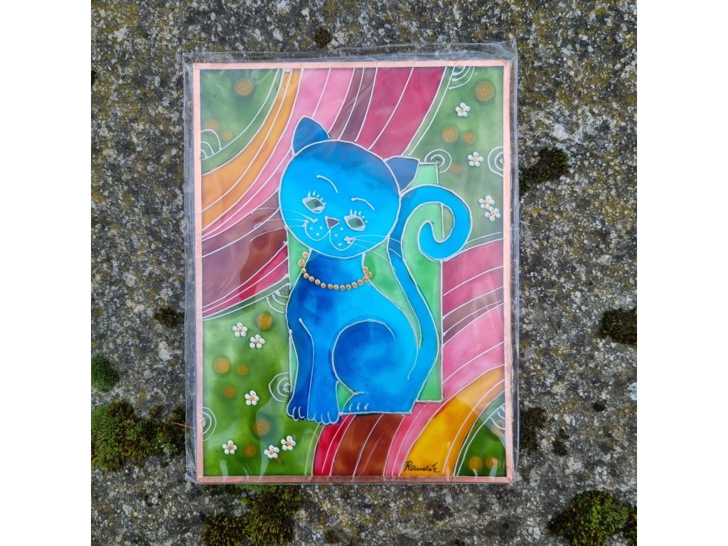 Modrá kočka v trávě – V. Randák – ručně malovaný obraz na skle