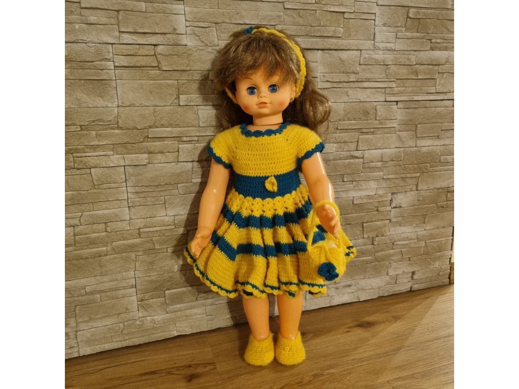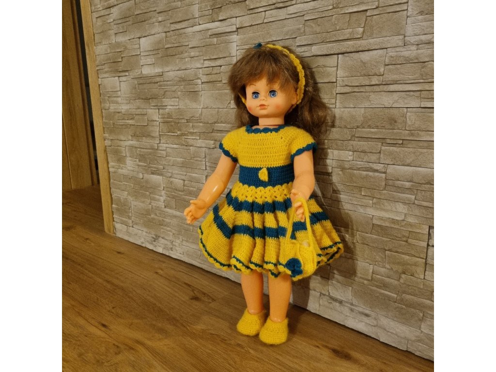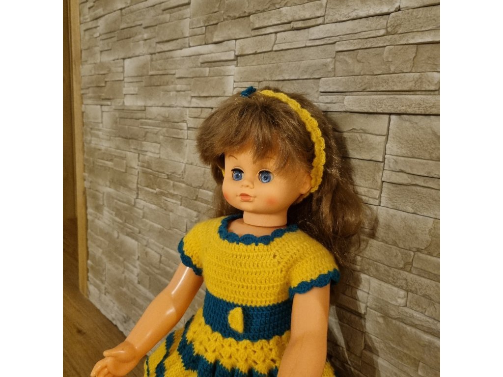 Panenka je oblečena do háčkovaných žlutých šatů, které jsou doplněny ručně vyrobenými háčkovanými doplňky: