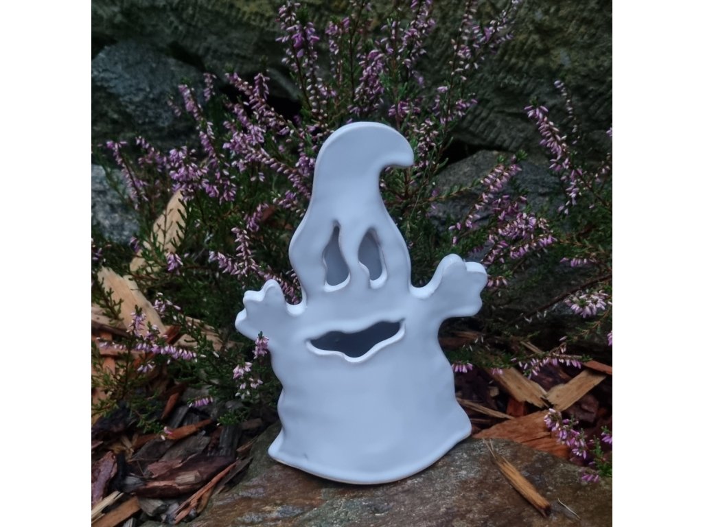 Ručně vyráběná keramická figurka s jemně tajemným výrazem, která slouží jako svícen pro čajovou svíčku. Po zapálení se světlo rozlévá skrz otvory a vytváří hřejivou podzimní atmosféru. Skvěle se hodí na parapet, komodu nebo jako součást sezónní výzdoby.