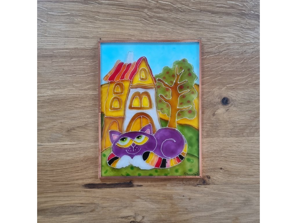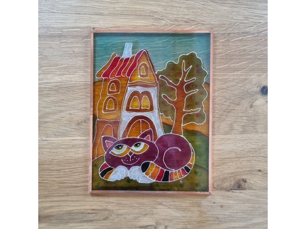 Spokojená kočka u domu – V. Randák – ručně malovaný obraz na skle