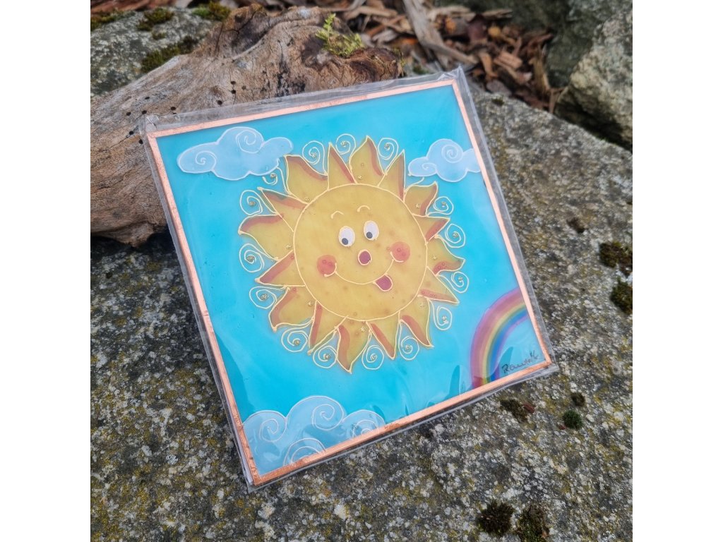 Veselé sluníčko na obláčku - V. Randák - ručně malovaný obraz na skle