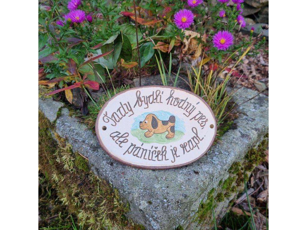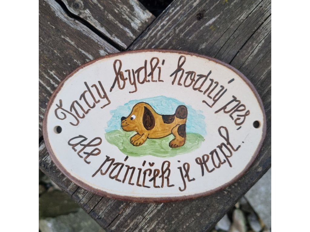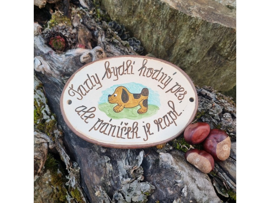 Originální keramická cedulka s vtipným nápisem, který pobaví každého kolemjdoucího i návštěvníka. Ideální pro milovníky psů, humoru a osobitého stylu. Ručně malováno českým výtvarníkem Mgr. Vlastimilem Randákem, který se kromě keramiky věnuje také malbě obrázků na skle.